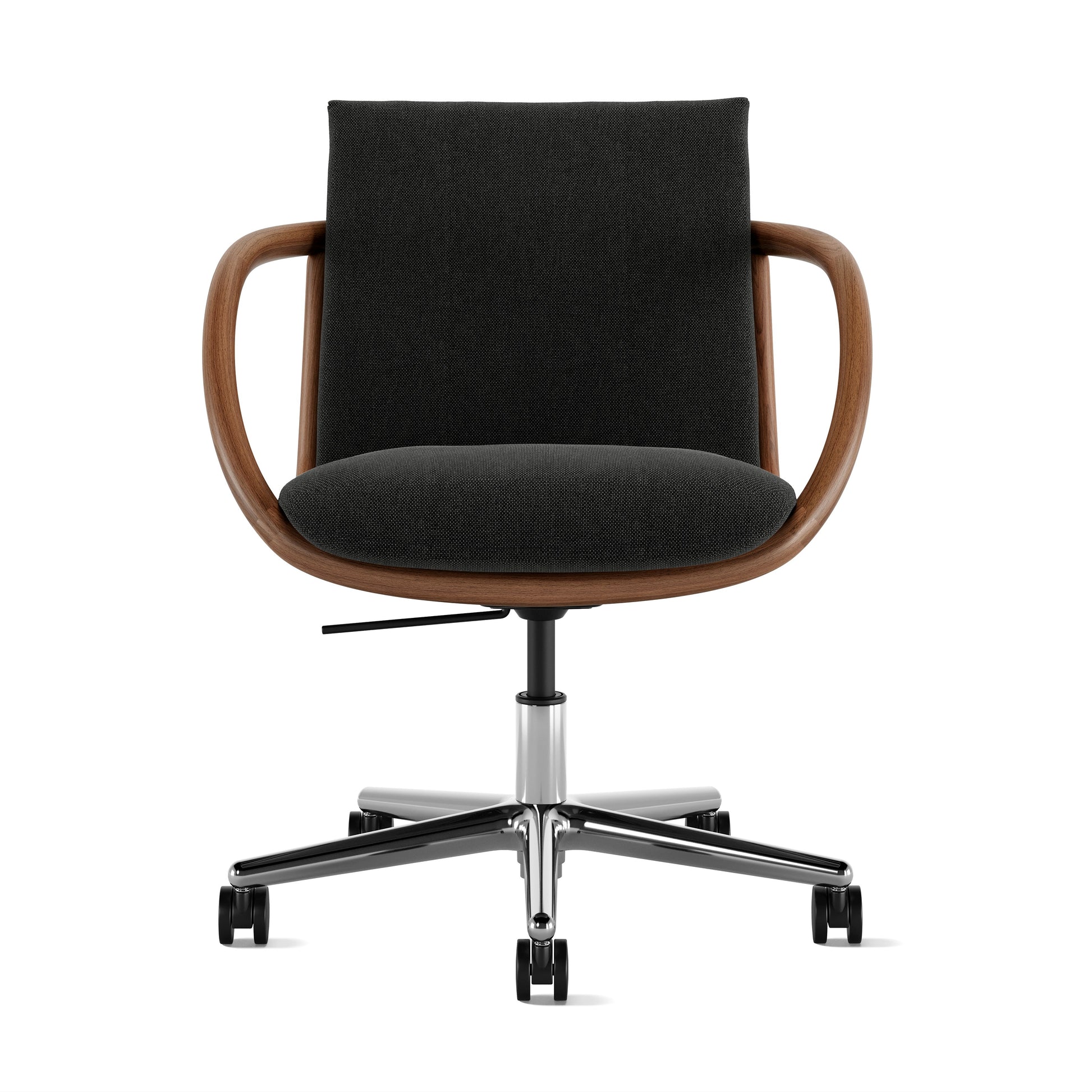 With its striking wraparound wood arms and supportive upholstered frame, the Full Loop Task Chair (2022) brings a warm sophistication to workspaces. Viennese designers EOOS treat their craft as a “poetic discipline,” and their lyricism is felt in Loop’s soft curves, rich materials, and polished five-star swivel base. Choose from fabric or leather upholstery and solid wood finishes to tailor the chair’s versatile elegance to your home or corner office. Made in U.S.A.